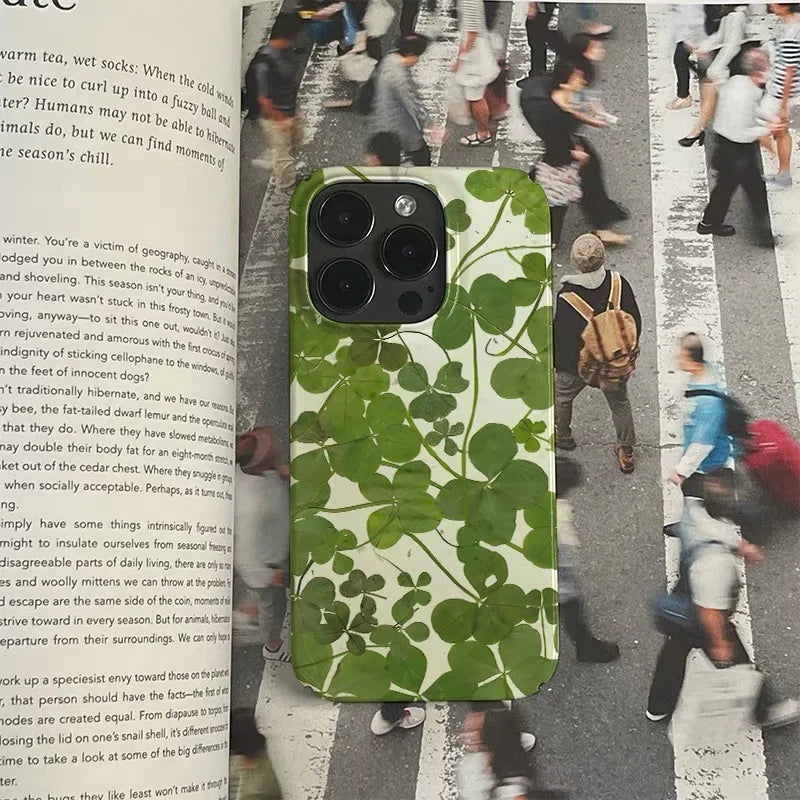 INS Korean Fresh Green Clover iPhone Case – Acrylic Protective Cover for iPhone 17 / 16 Pro Max / 15 / 14 Plus / 13 / 12 / 11 / Max / Mini