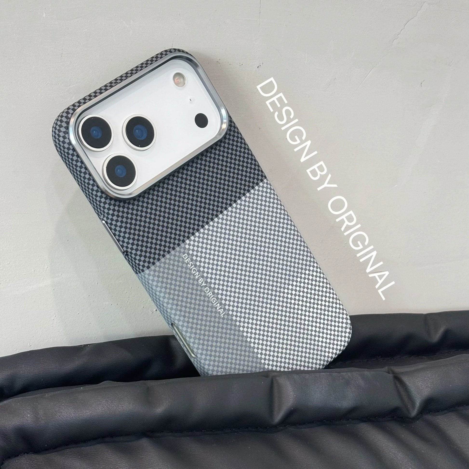 Slim Carbon Fiber Texture Massif Case for iPhone 17/16/15/14 Pro Max β Wireless Charging Compatible Hard PC Cover with Alloy Lens Protection